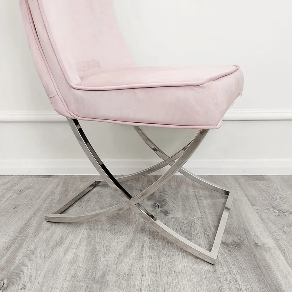 The Chrome Blush X-Leg Dining Chairs combine modern design with a touch of glamour, perfect for adding a sophisticated edge to any dining space. Upholstered in a luxurious blush pink velvet, these chairs feature elegant button-tufted detailing on the back, creating a timeless and elegant look. The unique chrome X-shaped legs add a striking visual statement, providing both style and stability.Designed for both comfort and aesthetics, the cushioned seat and contoured backrest offer a cozy dining experience. Available as a set of four, the Chrome Blush X-Leg Chairs are an ideal choice to enhance your dining area with chic elegance and bold flair.