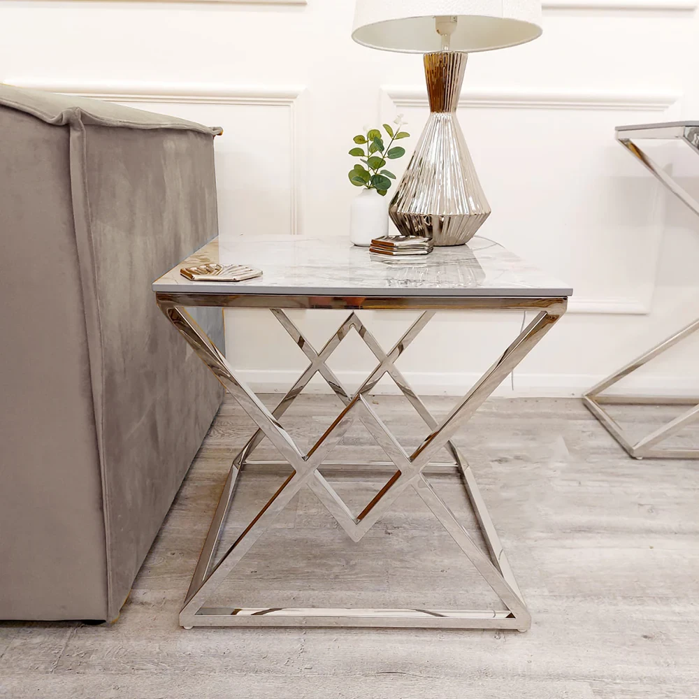 Add a stylish and functional accent to your room with the Aurora Chrome Lamp Table—ideal for enhancing any modern decor with its chic, structured design. -