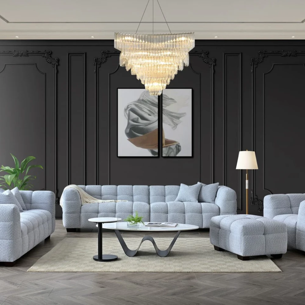 The Tribeca sofa has been crafted with deep channel stitching, and upholstered in a gorgeous pearl-coloured boucle fabric, making the sofa not only an eye-catching feature to any home, but a lavishly comfortable place to sit back and relax.A contemporary take on the Chesterfield design, the bold silhouette paired with the soft curves of the Tribeca Range expertly harmonises modern luxury with timeless opulence,Designed for comfort and durability; the Tribeca sofa is crafted from a durable wooden frame, the highest quality foam padding and finished in the soft textured boucle fabric. -