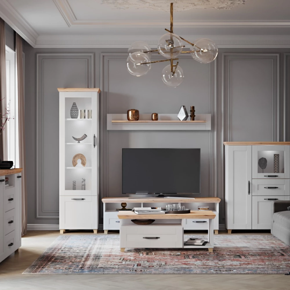 Contempo Glass Display Cabinet The Contempo glass display cabinet is a practical and elegant piece of furniture that provides space for storing your favorite decorations, books, or other items in your living room. Thanks to its low height, it allows easy access to items, while the glass panels contribute to the aesthetics and airiness of the space. Available in two original finishes: Artisan - Grey and Artisan - White. Features The cabinet's construction is made of 18 mm thick universal material, ensuring maximum stability and durability. The doors are made of 19 mm MDF, covered with PVC foil providing extra protection against moisture and exceptional resistance to wear and impact, and is easy to clean. Slow-close mechanisms allow for quiet and gentle door closing, preventing damage to doors and hinges, and contributing to the element's longer lifespan. Metal handles are very durable and resistant to wear and cracking.