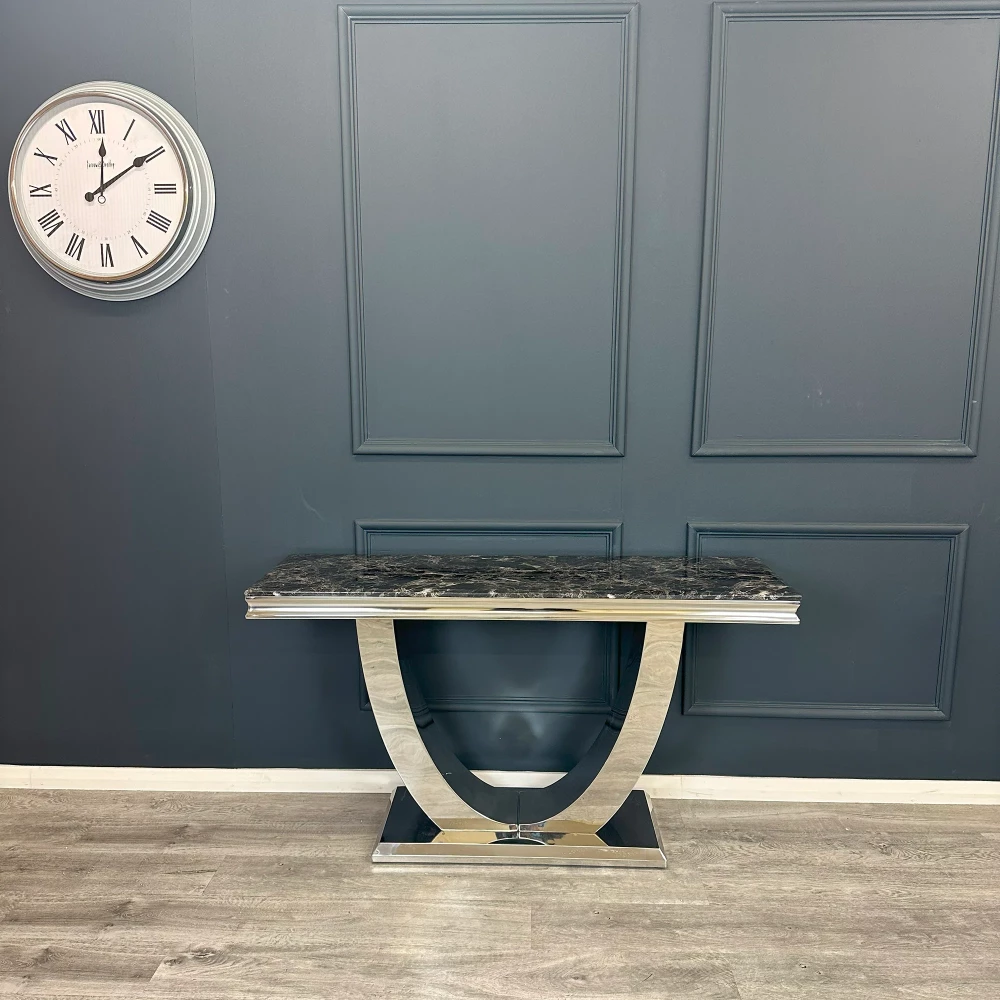 The Harper Console Table epitomizes ultra-chic elegance and luxurious living. Featuring a beautiful marble or glass top, complemented by a polished stainless steel swooping base, this console table makes a sophisticated statement in any room.Crafted with high-quality materials, all marble and glass tops are incredibly durable and scratch-resistant. The Arial pedestal base is solid and heavy, providing exceptional stability. With its sleek lines and smooth surfaces, the Harper Console Table is easy to clean, making it an ideal choice for busy households.Key Details of the Harper Console Table: