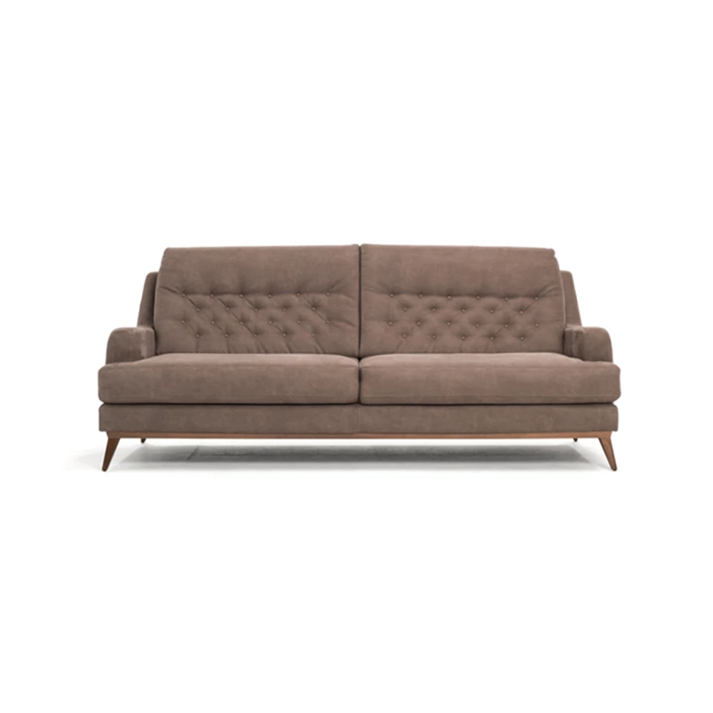 The sofa stands on a 17 cm high wooden frame, adding a classic touch with a slightly elevated design. This "Juliet" sofa, with its tufted backrest and plush cushioning, is a perfect blend of traditional charm and modern comfort, ideal for those looking to add warmth and sophistication to their home. -