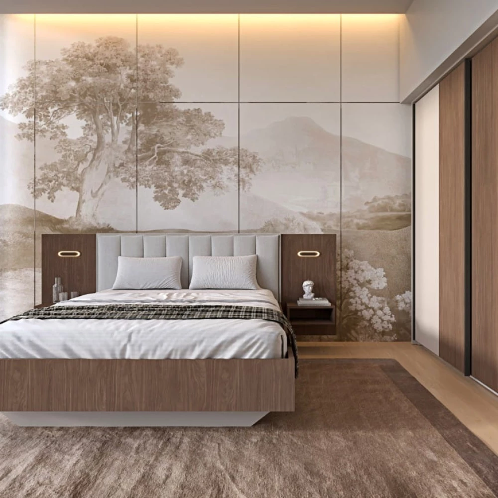 The Serene Crest Bed is where modern elegance meets functional design, crafted to transform any bedroom into a sanctuary of comfort and style. Featuring a sturdy wooden frame in a warm, natural finish, this bed exudes a sense of calm sophistication. The plush upholstered headboard is detailed with subtle vertical tufting, offering a cozy yet refined backdrop for relaxation. Built-in, floating bedside tables on each side provide convenient storage and feature integrated lighting, allowing for a streamlined aesthetic and nighttime convenience.