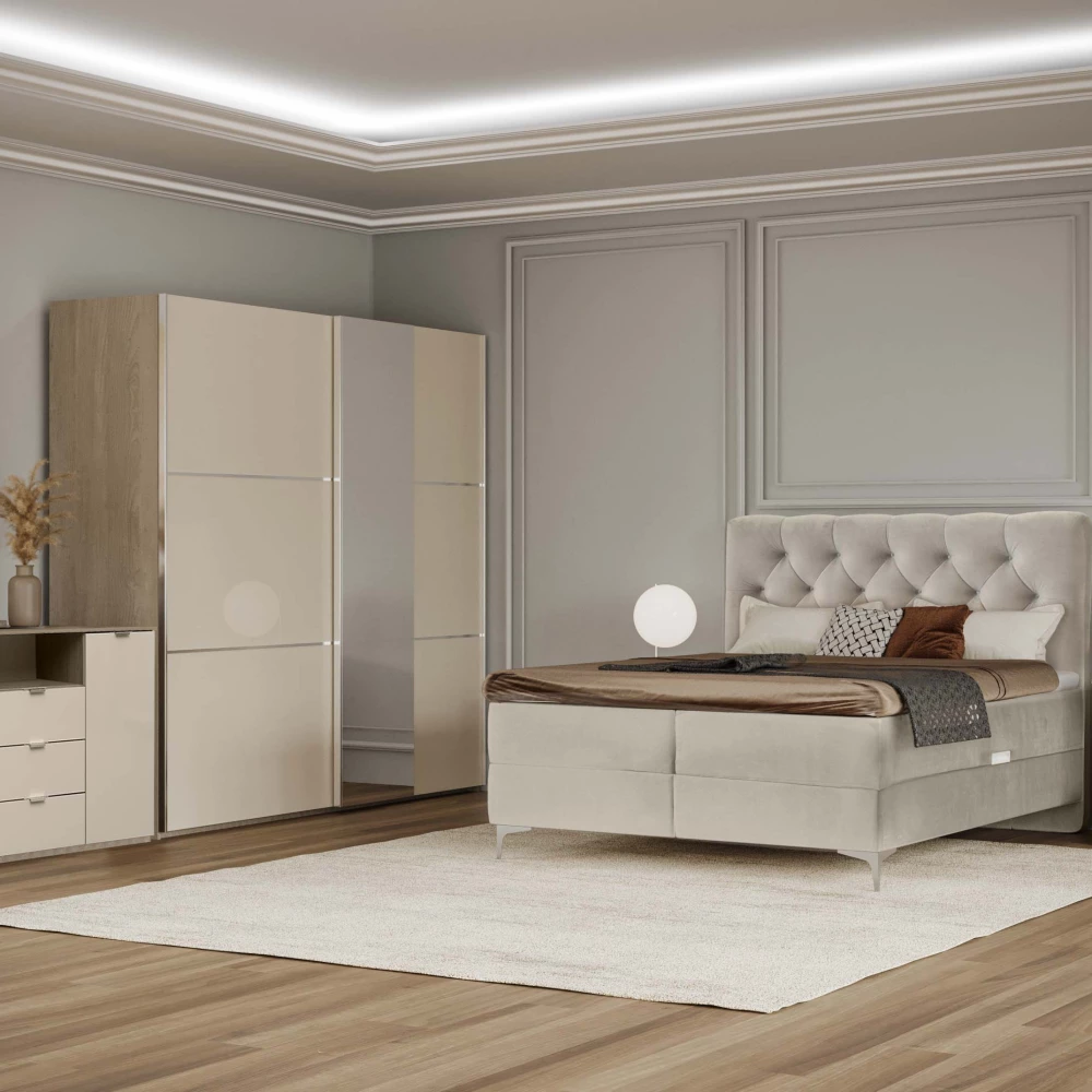 The TITTO Boxspring bed TITTO features a beautiful design, good functionality, excellent craftsmanship, high-quality materials, and a high level of sleeping comfort. The large built-in storage boxes make it a significantly more functional product compared to standard boxspring beds, where the drawers or boxes have much smaller capacities and require large spaces to access them. The TITTO is designed and manufactured exclusively for use with a mattress topper. It is not intended for use without a topper, and using it without a topper voids the warranty.